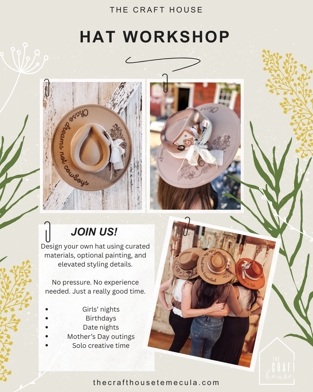 Join us for a guided Hat Workshop where you’ll design and style your own wide-brim hat, perfect for spring events, winery days, and girls’ nights out.